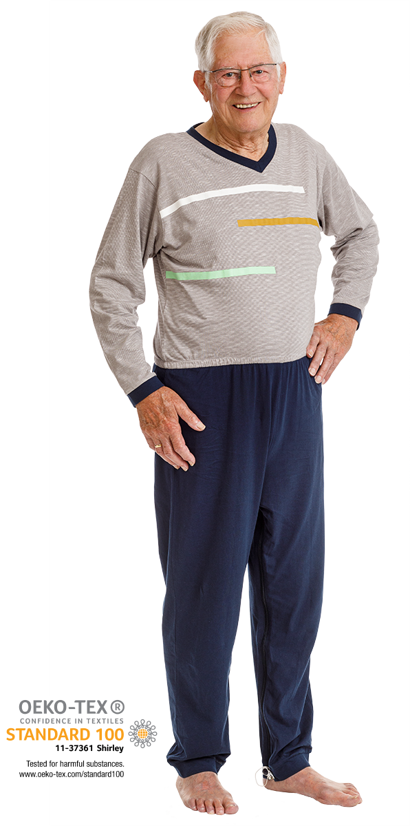 Irrotettava lahkeen vetoketju helpottaa inkontinenssisuojien vaihtamista hoitajille ja vaikeuttaa potilaiden riisumista. Pehmeä ja ihoystävällinen materiaali varmistaa maksimaalisen mukavuuden sekä makuuasennossa että liikunnan aikana. Yläosa on ommeltu kiinni alaosaan, mikä estää potilaita riisuutumasta itsenäisesti. Hoitohaalari sopii sekä miehille että naisille ja antaa potilaille tunteen tavallisesta pyjamasta.